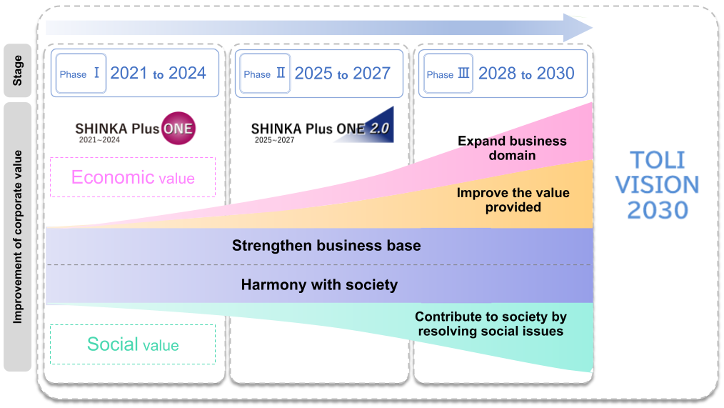 The Medium-Term Business Plan, "SHINKA Plus ONE 2.0," is positioned as a phase in which we will "challenge to further evolution" toward realizing <TOLI VISION 2030>. We aim to maximize the investment benefits implemented under the previous Medium-Term Business Plan, "SHINKA Plus ONE," while also incorporating new growth strategies to achieve sustainable growth (value-up) for the TOLI Group.