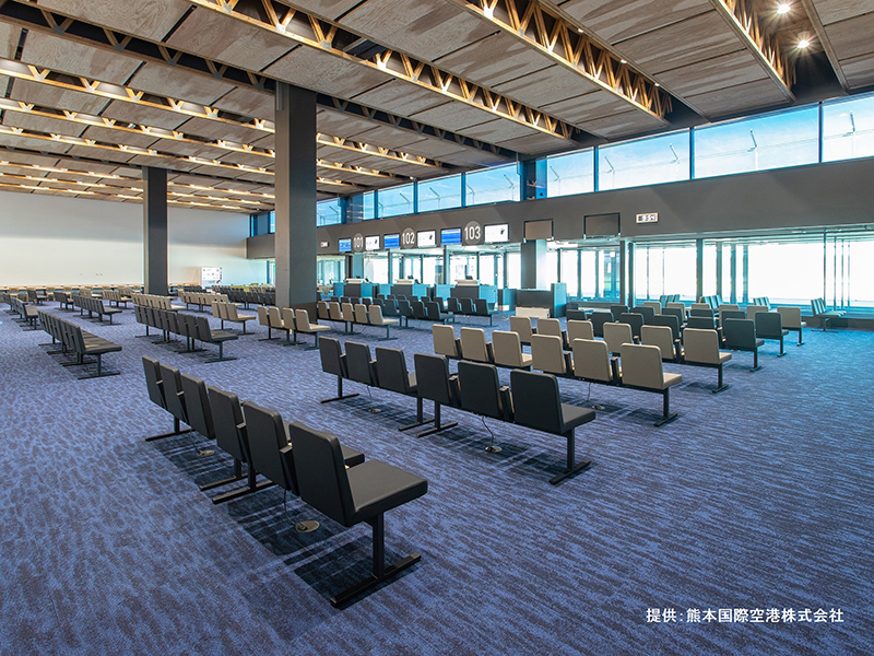 熊本地震からの創造的復興のシンボルである「阿蘇くまもと空港新旅客ターミナルビル」が2023年3月に開業。環境デザインコンセプトは、「Stream Line(ストリームライン)」。空と大地、人と空間を心地よくつなぐラインを表現しています。ボーダーやルーバー、床などに流れるような曲線や緩やかなラインを用い、空間全体が一体感を持ったデザインとなっています。