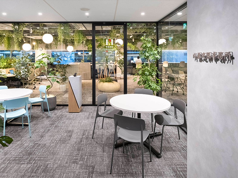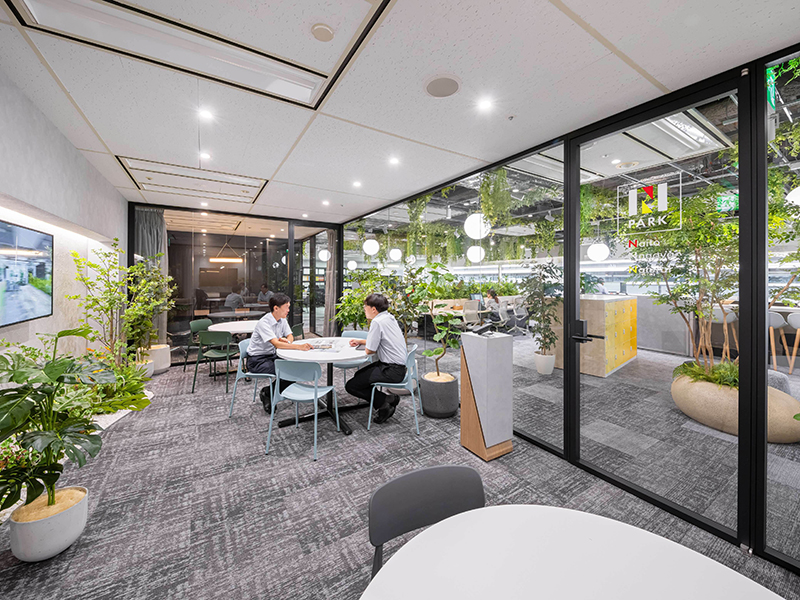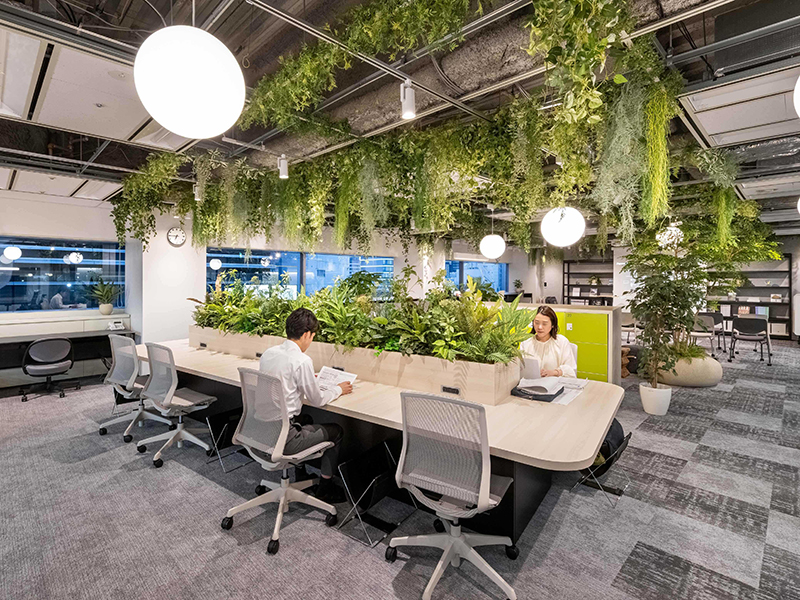 新オフィスはそのテーマのとおり人が行き交う公園のようにオープンな雰囲気。自然を感じながら心地よく働ける環境を目指した大胆なバイオフィリックデザインが特徴です。デスク周辺から天井に至るまで随所にグリーンインテリアを配し、球形のペンダントライトと合わせることで魅力的な演出を施しています。