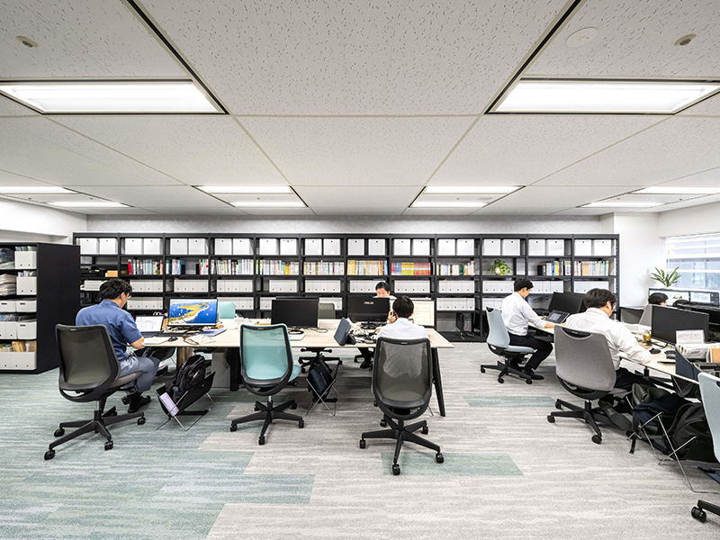 床仕上げ材には、大地の表情や水面のきらめきなど、美しい自然景観から着想したデザインのタイルカーペットが採用されました。