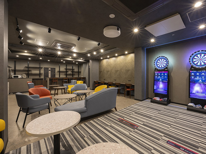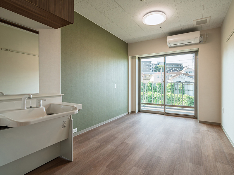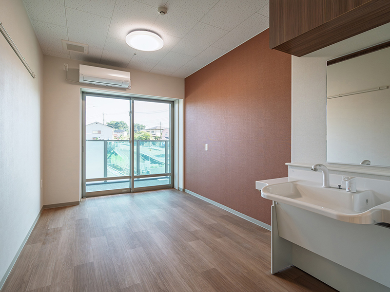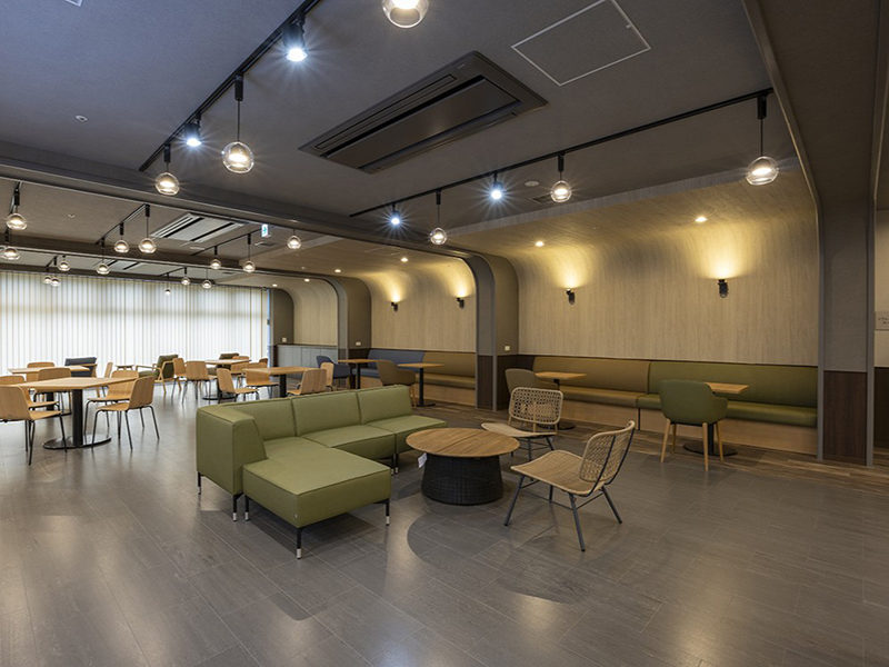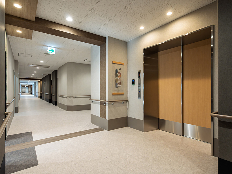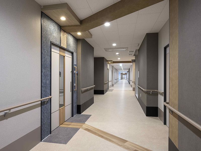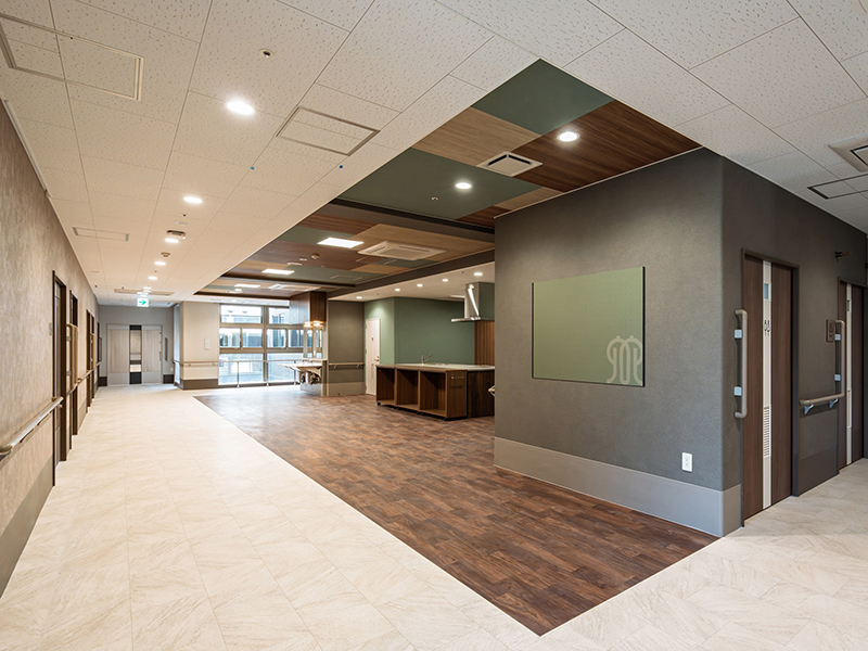 当施設では、アニマルセラピーの一環として、ペットと共に暮らせる生活空間や職員の息抜きの場であるリフレッシュルームの開設など独自の試みを実施しています。特養ユニットは画一的にならずそれぞれのユニットが固有の空間となるように、8 色の色彩をアクセントとして、県章や犬種をサインとして取り入れた空間デザインとしています。西棟と東棟を繋ぐ中央廊下に面した各ユニット玄関には、ユニット入口が視認しやすいように、床壁建具天井を含めてぐるり1周するデザインを採用しました。また、リフレッシュルームは「大人の隠れ家」をテーマに、全体的に落ち着いた色調を採用しつつ、抽象的な柄をアクセントに加えました。鮮やかな色彩の家具が映えるように統一感を持たせています。