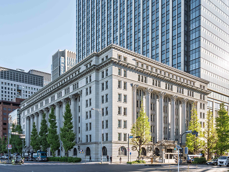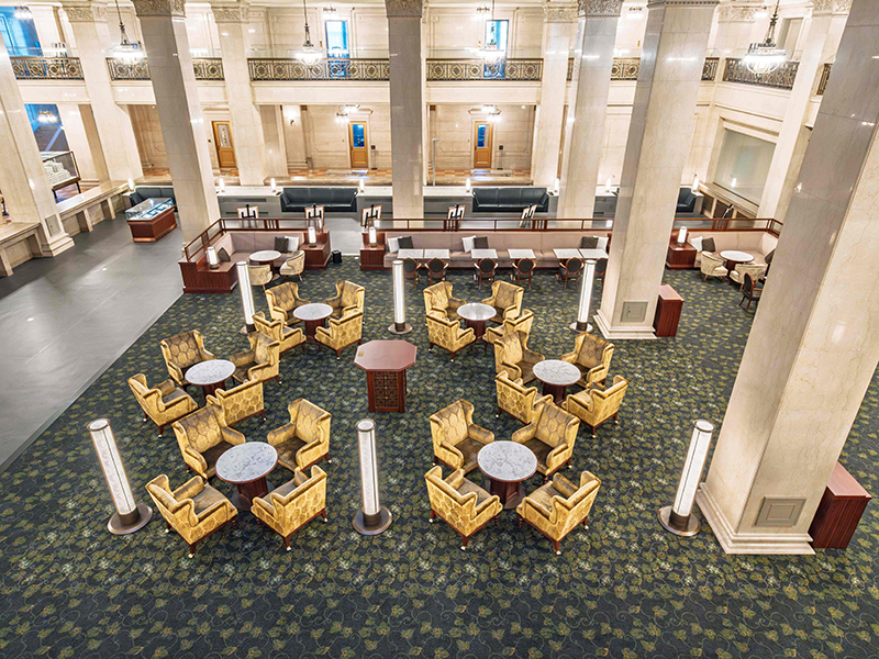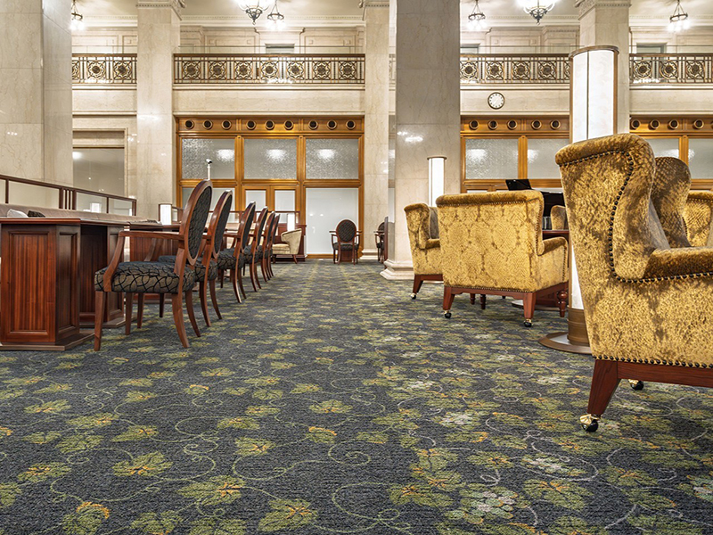 荘厳で特別な空間にふさわしい葡萄柄のカーペットは、東リエクスクローム5000特注品。歴史的価値や物語により深くふれていただけるように生まれ変わった明治生命館は、来館者が大幅に増加。東京・丸の内エリアの文化発信拠点として、これからもますます多くの人々を惹きつけていきます。