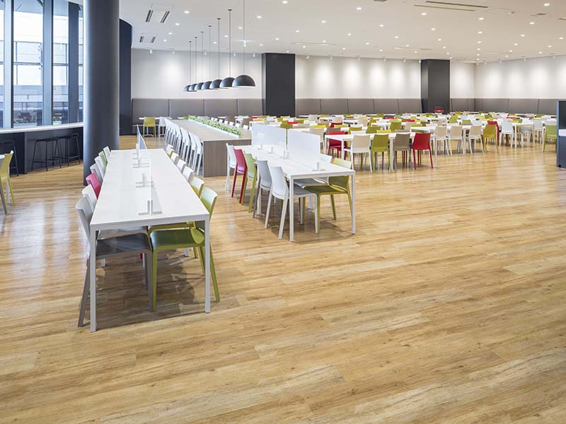 オフィスユーザーの食堂であるカフェテリアは、ロイヤルウッドが採用されました。色違いの2種類を7:3の割合で使用することで、自然な木の印象を表現しています。