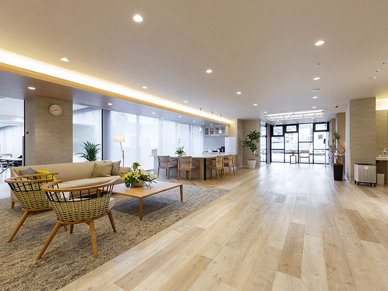 花小金井駅に位置する介護付有料老人ホーム。温もりがあって、どこか愛らしい、" ほっこりとした暮らし”をテーマにコーディネートを提案。花小金井駅の由来に因んで、館内にはふんだんに桜のモチーフが取り入れられています。提案のメインである1F~3F 廊下は桜の花びらが舞い散る街道をイメージして、