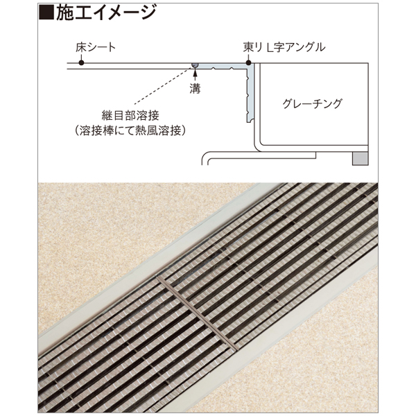 床シートと側溝部(グレーチング設置部)の取り合い部用副資材。水やお湯等のまわり込みを防ぎます。