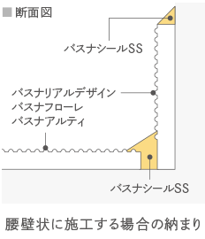 シートを帯状にカットし、床と壁を別々に施工する場合は図のように床面と壁面の間に5mm程度の隙間を空けて、バスナシールSSで処理してください。