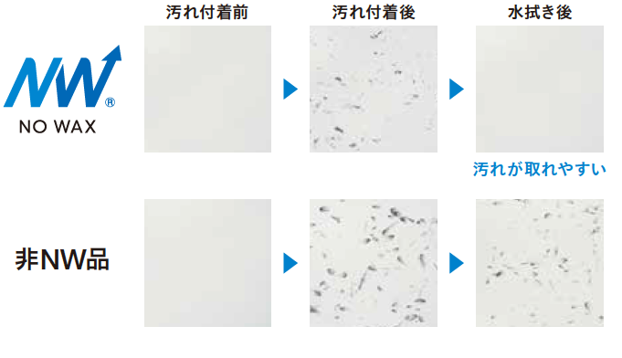 「NW」は「ノーワックス」を意味し、ワックスによるメンテナンスが不要な床材です。