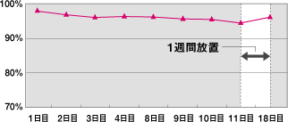 【試験結果】![]() ◆上のグラフから次のことが確認されました。 ● 繰返し試験で、常に高い消臭性能を維持している。 ● 1週間放置後で消臭性能が回復している。 |